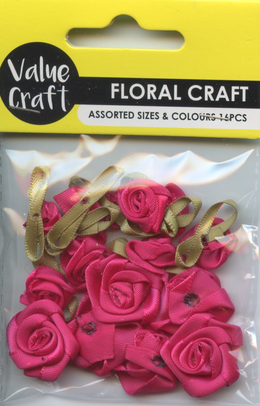 Craft Ribbon Satin Roses & Leaves - Hot Pink - 16 pk - Various sizes